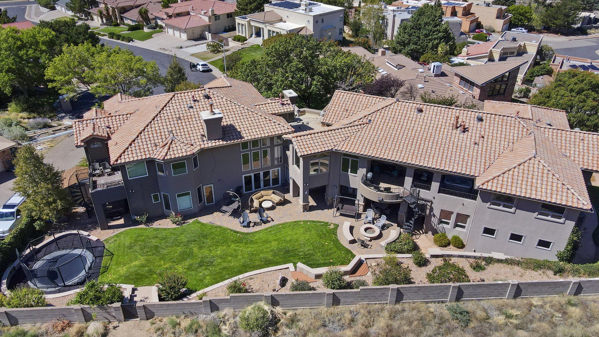 Nestled in the Albuquerque Foothills, this exceptional property offers direct backyard access to the Embudito Canyon Loop, open space and miles of scenic trails. Designed with flexibility in mind, it features multiple primary suites and distinct living areas--an ideal layout for multi-generational living or hosting long-term guests.Step outside to a beautifully landscaped oasis where you can unwind to the sound of tranquil water features, grill on the covered patio, or enjoy the hot tub while taking in breathtaking mountain views. The grounds also include mature peach, apple, cherry, plum trees, and grape vines.